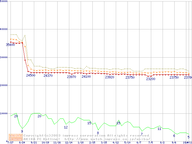 Socket 370 (FC-PGA2,FSB 133MHz,L2 512KB,Tualatin)の最安値推移