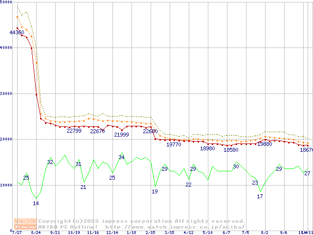 Socket 478 (micro-PGA,FSB 533MHz,L2 512KB,Northwood)の最安値推移