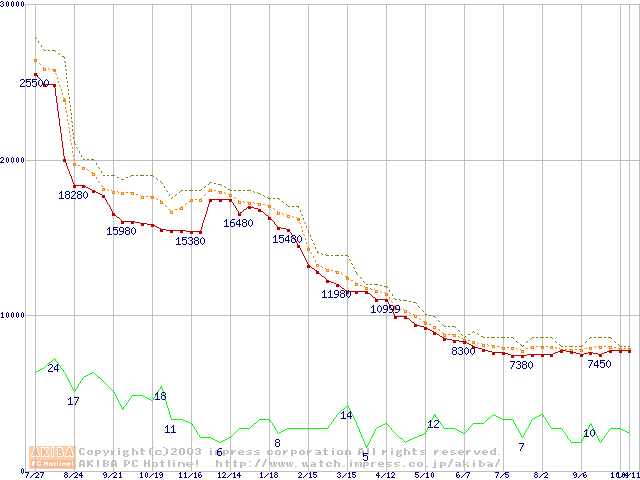 Socket A (OPGA,FSB 266MHz,L2 256KB,Thoroughbred)の最安値推移