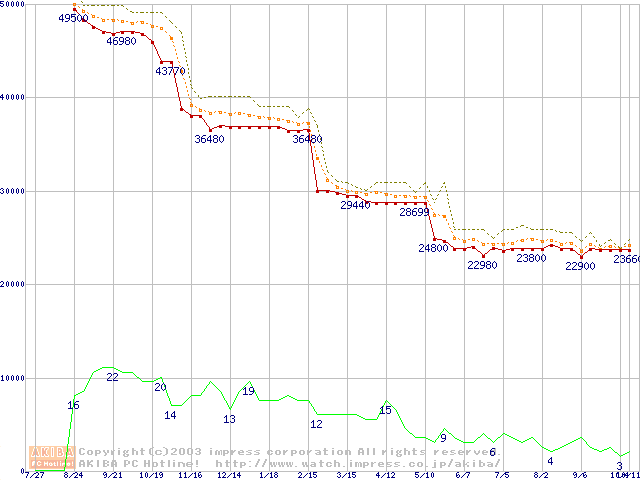 Socket 478 (micro-PGA,FSB 400MHz,L2 512KB,Northwood)の最安値推移