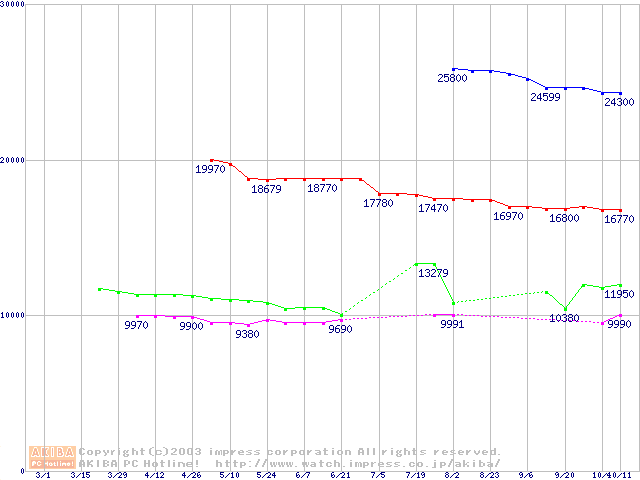| [↑前グラフ]: | MKシリーズ (9.5mm,4200rpm,2MB,FDB,20GB/Platter)の最安値推移 |