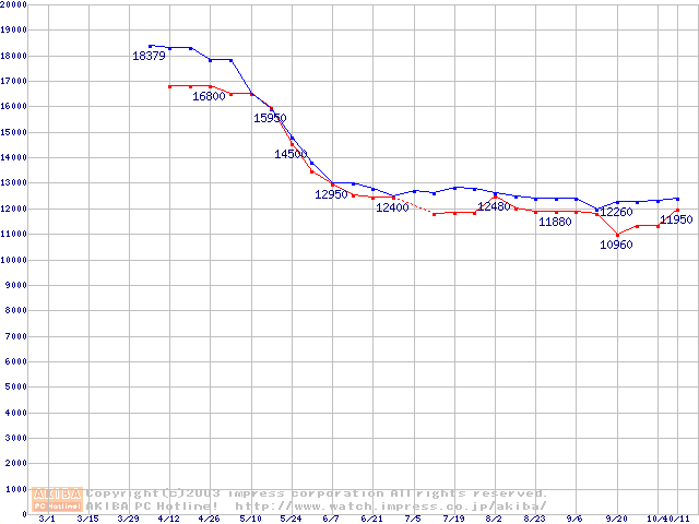 | [↑前グラフ]: | Travelstar 80GN (9.5mm,4200rpm,UltraATA/100,8MB,FDB,40GB/Platter)の最安値推移 |