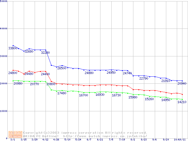 | Socket A (OPGA,FSB 266MHz,L2 256KB,Thoroughbred)の最安値推移 |