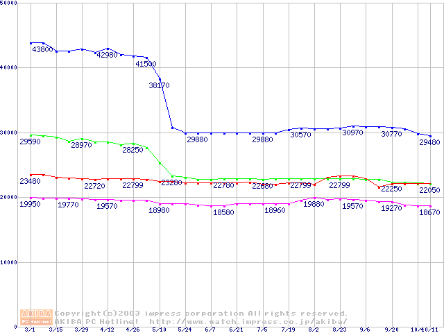 | [↑前グラフ]: | Socket 478 (micro-PGA,FSB 533MHz,L2 512KB,Hyper-Threading,Northwood)の最安値推移 |