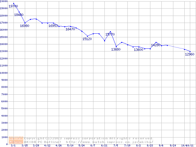 | [↑前グラフ]: | MaXLine II (5400rpm,UltraATA/133,2MB,80GB/Platter,BB)の最安値推移 |
