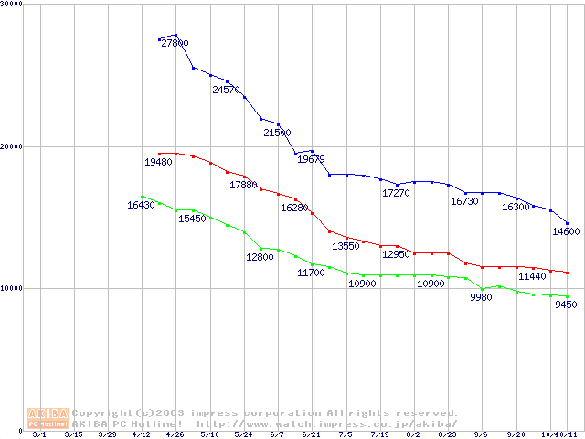 | [↑前グラフ]: | Fireball 3 (5400rpm,UltraATA/133,2MB,FDB)の最安値推移 |
