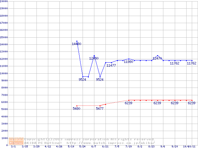 | [↓次グラフ]: | PC3200(DDR400) DDR SDRAM DIMM ECC対応 Registeredタイプの最安値推移 |
