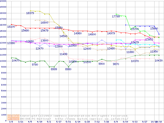 2.5インチHDD主要製品(最安値1万円~1万5千円未満)の最安値推移