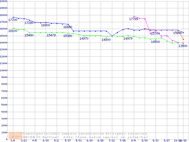 | [↑前グラフ]: | 2.5インチHDD 40GB~50GB未満(9.5mm厚,4200rpm)の最安値推移 |