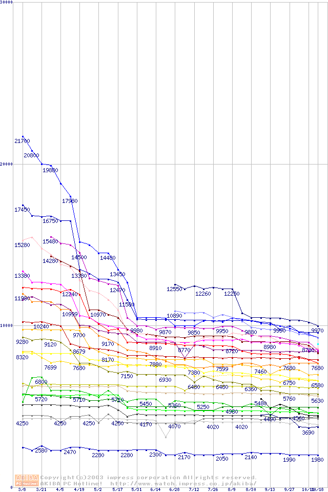CPU主要製品(最安値1万円~2万円未満)の最安値推移