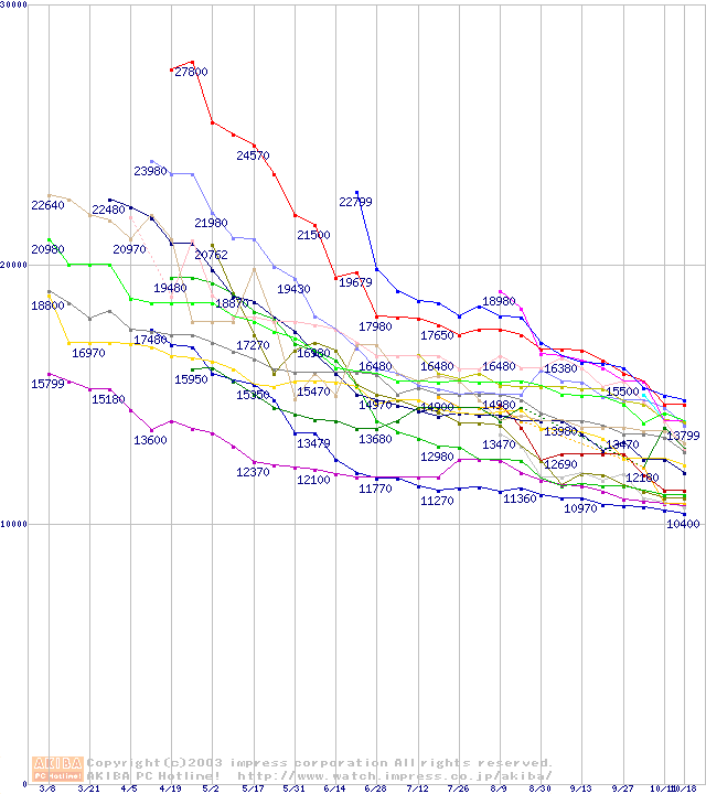 HDD主要製品(最安値1万5千円~2万円未満)の最安値推移