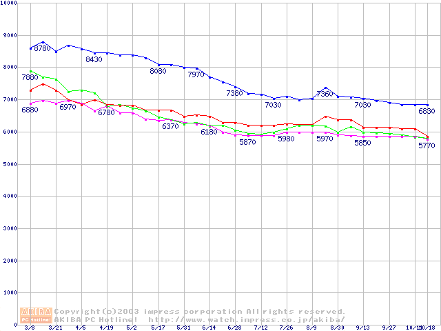 | [↑前グラフ]: | HDD 20GB~30GB未満(5400rpmクラス)の最安値推移 |
