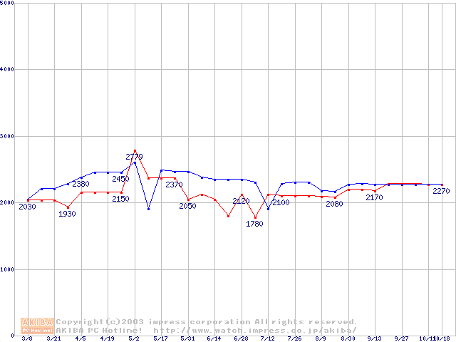 メモリ主要製品(最安値5千円未満)の最安値推移