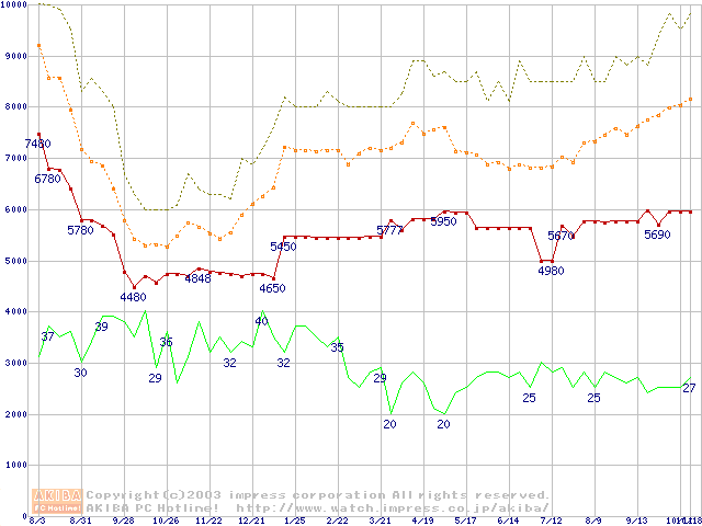 PC133 SDRAM DIMM CasLatency=3の最安値推移