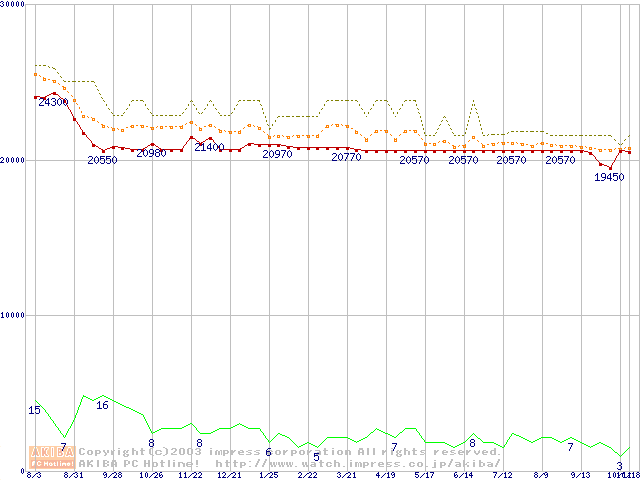 Socket 370 (FC-PGA2,FSB 133MHz,L2 512KB,Tualatin)の最安値推移