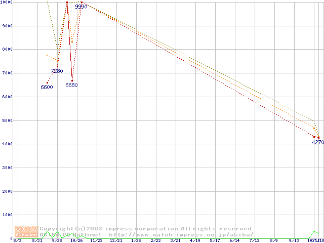 Socket 370 (FC-PGA,FSB 100MHz,L2 128KB,Coppermine)の最安値推移