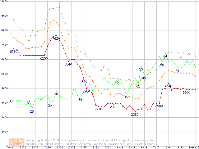 PC2700(DDR333) DDR SDRAM DIMMの最安値推移