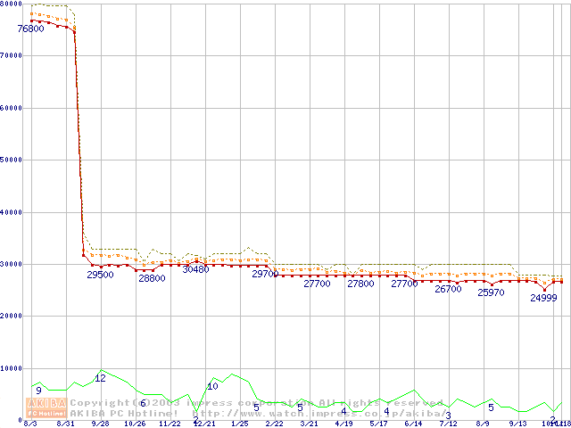 Socket 603 (micro-PGA,FSB 400MHz,L2 512KB,Prestonia)の最安値推移