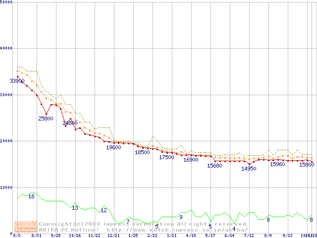 2.5インチHDD主要製品(最安値1万5千円~2万円未満)の最安値推移