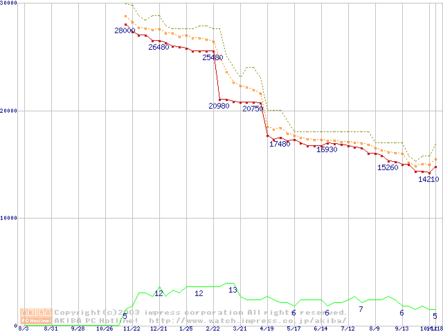 Socket A (OPGA,FSB 266MHz,L2 256KB,Thoroughbred)の最安値推移