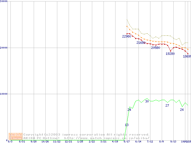 Socket 478 (micro-PGA,FSB 800MHz,L2 512KB,Hyper-Threading,Northwood)の最安値推移