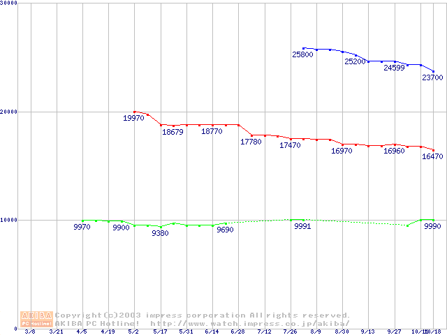 | [↑前グラフ]: | MKシリーズ (9.5mm,4200rpm,2MB,FDB,20GB/Platter)の最安値推移 |