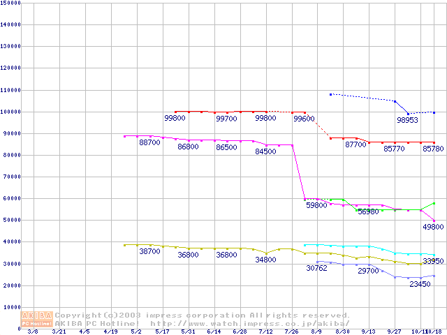 | [↓次グラフ]: | Socket A (OPGA,FSB 400MHz,L2 512KB,Barton)の最安値推移 |