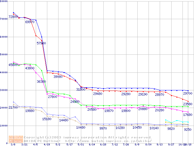 | [↓次グラフ]: | Socket A (OPGA,FSB 333MHz,L2 256KB,Thoroughbred)の最安値推移 |