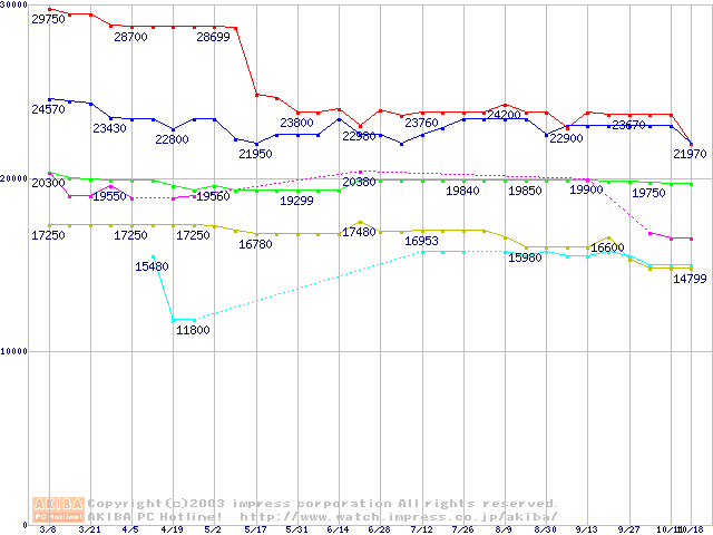 | [↑前グラフ]: | Socket 478 (micro-PGA,FSB 533MHz,L2 512KB,Northwood)の最安値推移 |