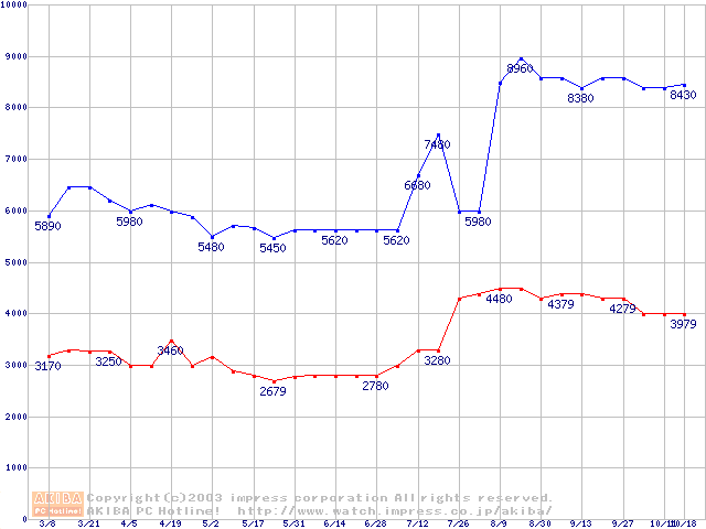 | [↓次グラフ]: | PC2100(DDR266) DDR SDRAM DIMM ECC対応 Registeredタイプの最安値推移 |