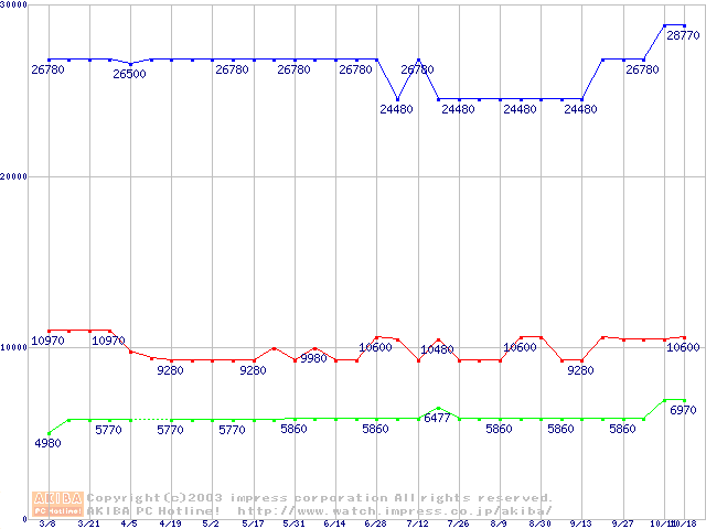 | [↑前グラフ]: | PC800-40 DRDRAM RIMMの最安値推移 |