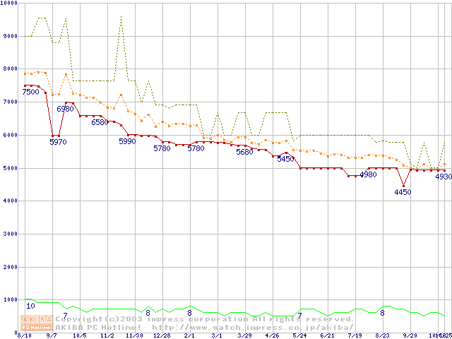 Socket A (PGA,FSB 266MHz,L2 256KB,Thunderbird)の最安値推移