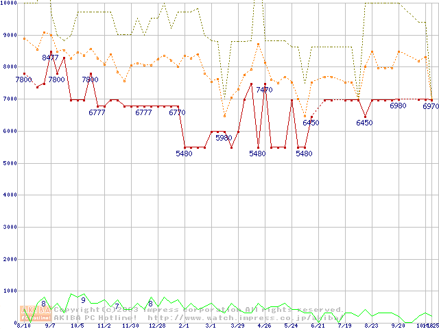 PC133 SDRAM DIMM CasLatency=3 ECC対応 Registeredタイプの最安値推移