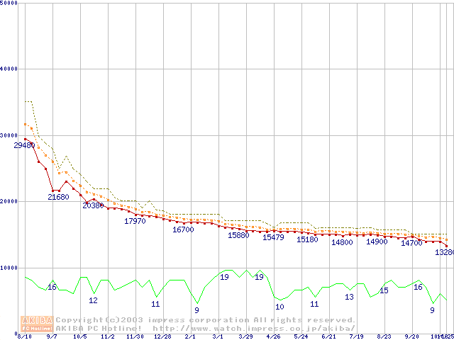 Travelstar 40GNX (9.5mm,5400rpm,UltraATA/100,8MB,FDB,20GB/Platter)の最安値推移