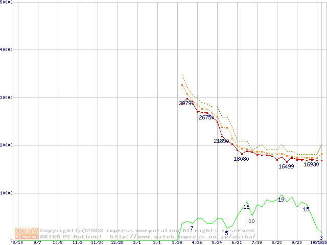 Travelstar 80GN (9.5mm,4200rpm,UltraATA/100,8MB,FDB,40GB/Platter)の最安値推移