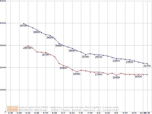 | [↑前グラフ]: | Travelstar DK23EB (9.5mm,5400rpm,UltraATA/100,512KB)の最安値推移 |
