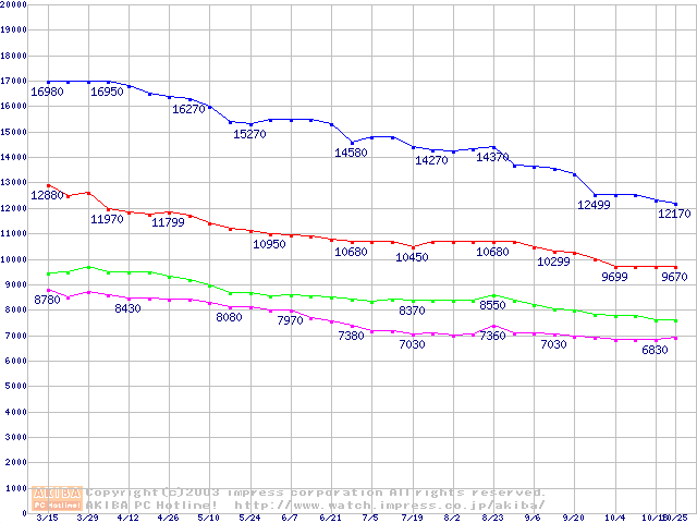 | [↑前グラフ]: | MaXLine II (5400rpm,UltraATA/133,2MB,80GB/Platter,BB)の最安値推移 |
