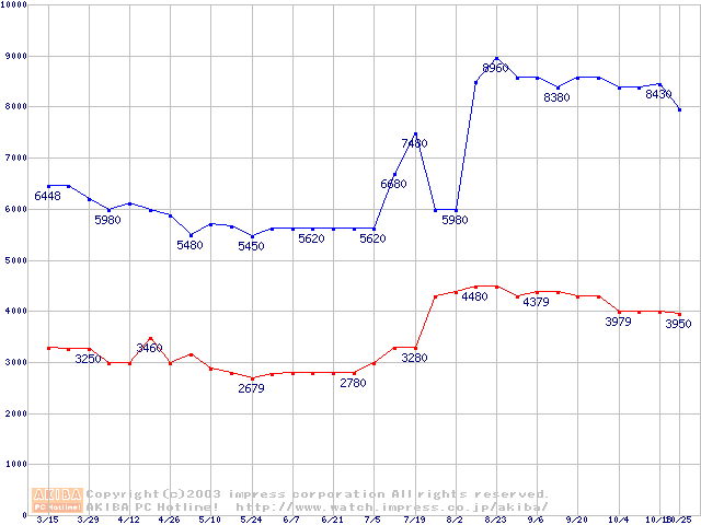 | [↓次グラフ]: | PC2100(DDR266) DDR SDRAM DIMM ECC対応 Registeredタイプの最安値推移 |