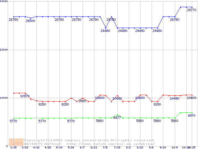 | [↑前グラフ]: | PC800-40 DRDRAM RIMMの最安値推移 |