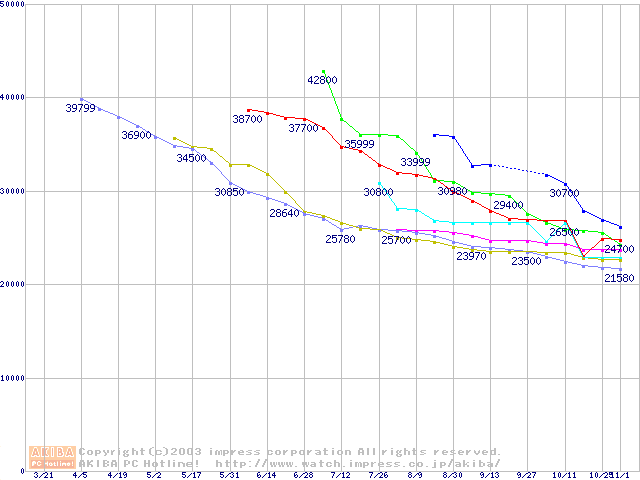 | [↓次グラフ]: | 2.5インチHDD 20GB~40GB未満(9.5mm厚)の最安値推移 |