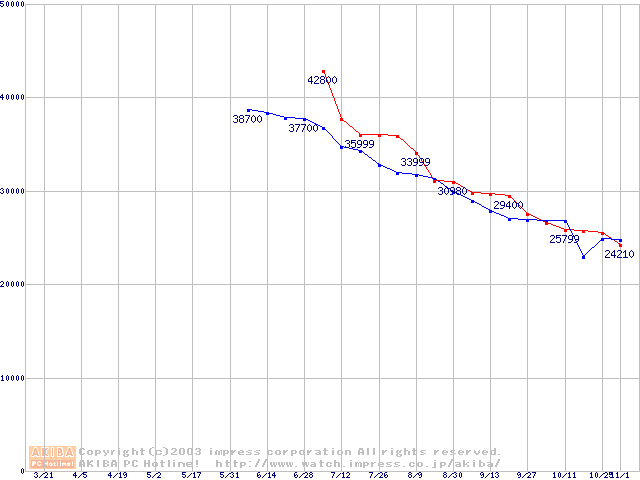 | [↑前グラフ]: | 2.5インチHDD 40GB~50GB未満(9.5mm厚,5400rpm)の最安値推移 |