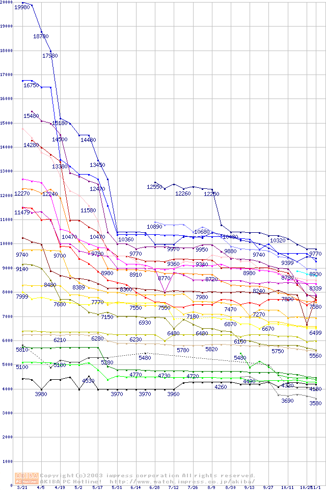 CPU主要製品(最安値1万円~2万円未満)の最安値推移
