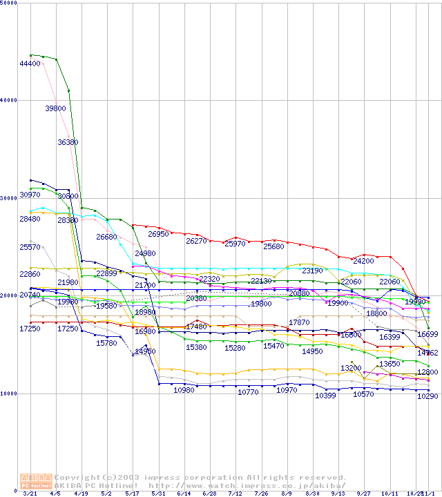 CPU主要製品(最安値1万円~2万円未満)の最安値推移