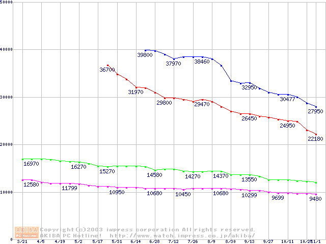 | [↓次グラフ]: | HDD 30GB~80GB未満(7200rpmクラス)の最安値推移 |