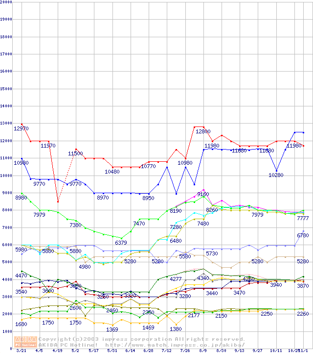 メモリ主要製品の最安値推移