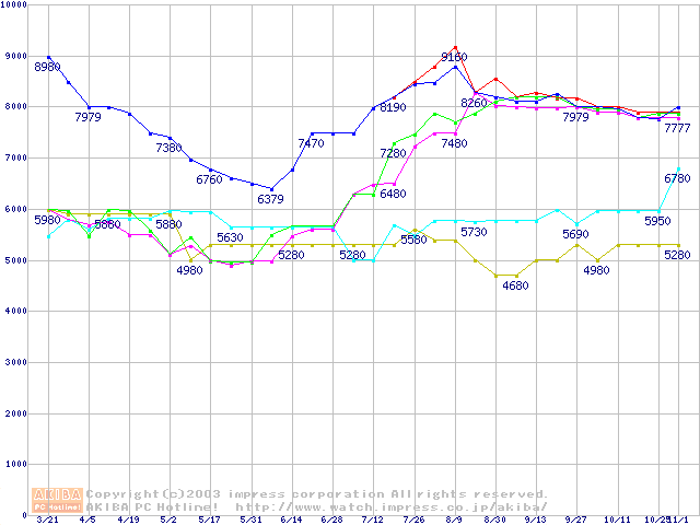 メモリ主要製品(最安値5千円~1万円未満)の最安値推移