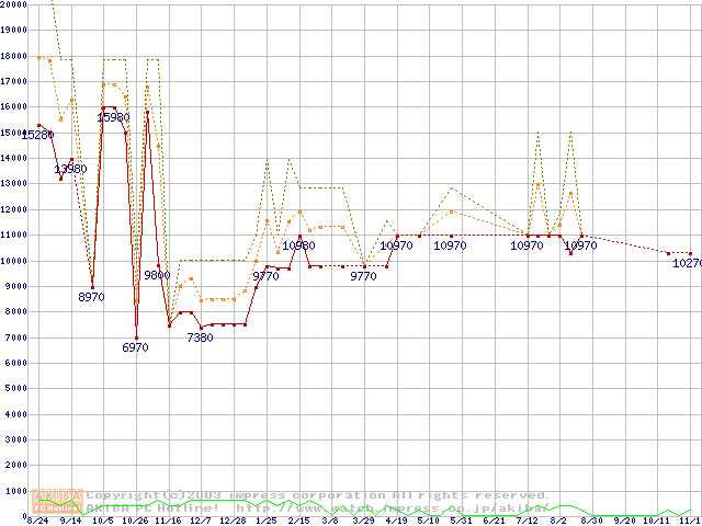 PC133 SDRAM DIMM CasLatency=3 ECC対応の最安値推移