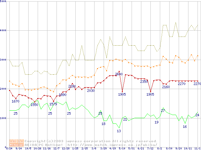 PC100 SDRAM DIMM CasLatency=2の最安値推移