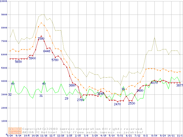 メモリ主要製品(最安値5千円未満)の最安値推移