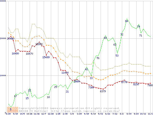 PC3200(DDR400) DDR SDRAM DIMMの最安値推移